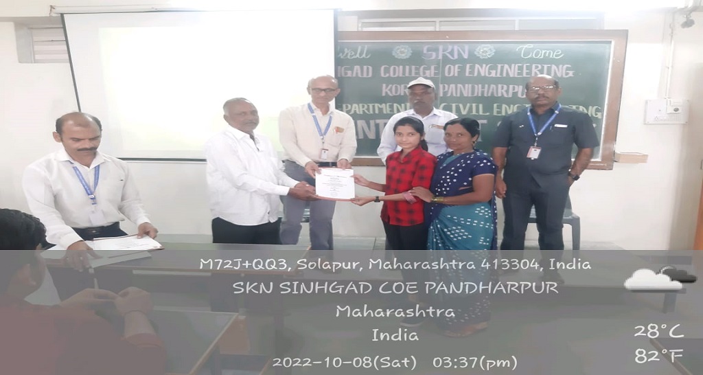 3M/s C. P. Bagal Infra Pvt. Ltd., Pune / Pandharpur.Providing knowledge to students about different construction practices used in Civil Engineering field through Internship, field trainings, site visits, etc.11/19/20225Active