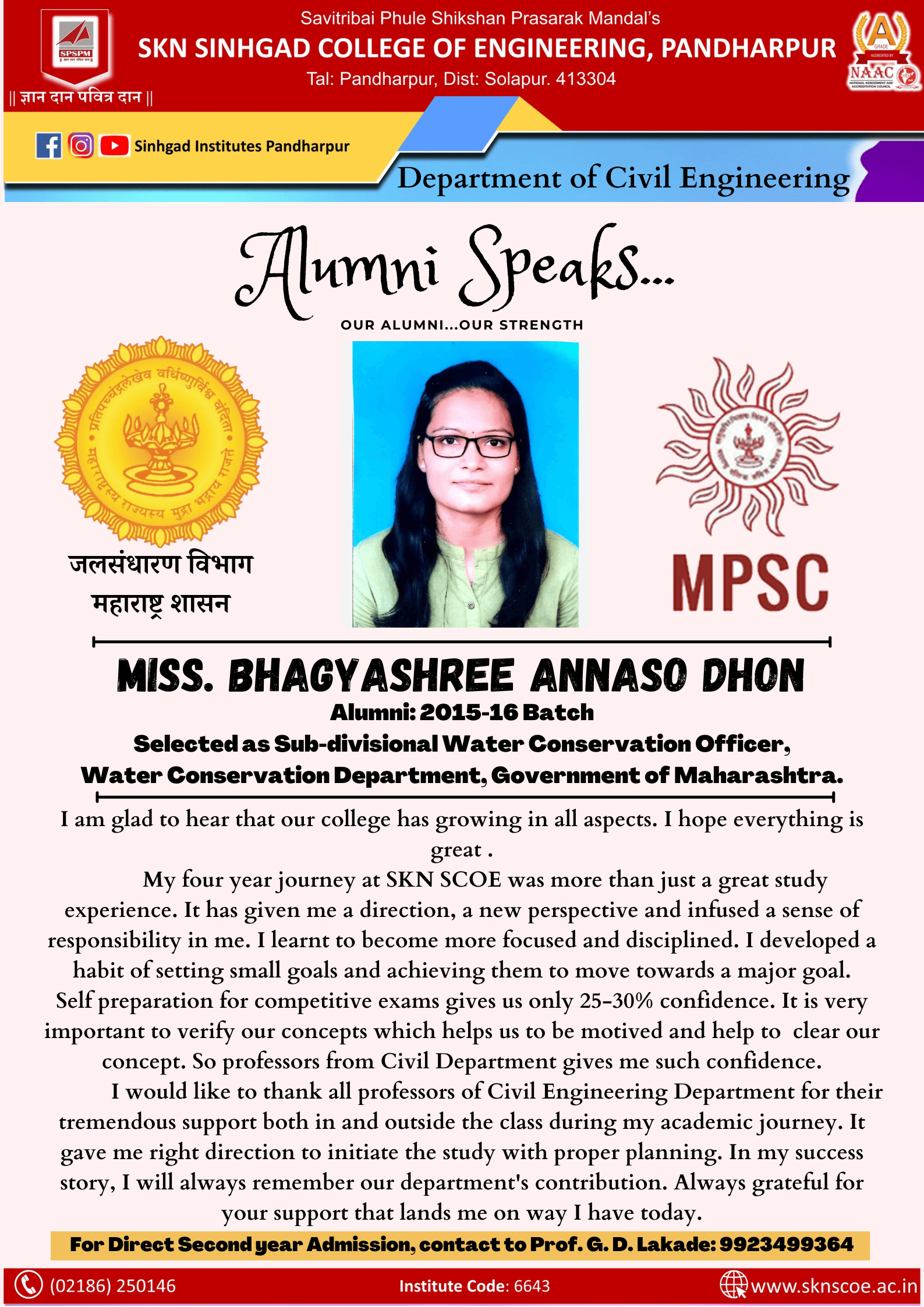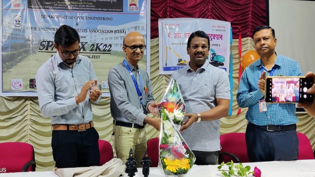 We encourage our students for participating in the National level events like Spectrum, WEENGS, etc. Students are participating in project exhibition at University and State Level “Avishkar”. Department received grants from AICTE, PAHSUS as mentioned below; Seed Money for Research from Punyashlok Ahilyadevi Holkar Solapur University, Solapur for the project entitled “Performance evaluation of porous concrete using supplementary cementitious materials for improvement of mechanical properties” for the year 2023-24 received a grant of Rs. 70000/- Research grant from AICTE for Mission Amrit Sarovar-Jal Dharohar Sanrakshan for the year 2022-23 received a grant Rs. 200000/- Seed Money for Research from Punyashlok Ahilyadevi Holkar Solapur University, for Design of IOT based Water Quality Analyzer for Chandrabhaga River at ghat locations in Pandharpur for year 2021-22, received a grant of Rs. 80000/-