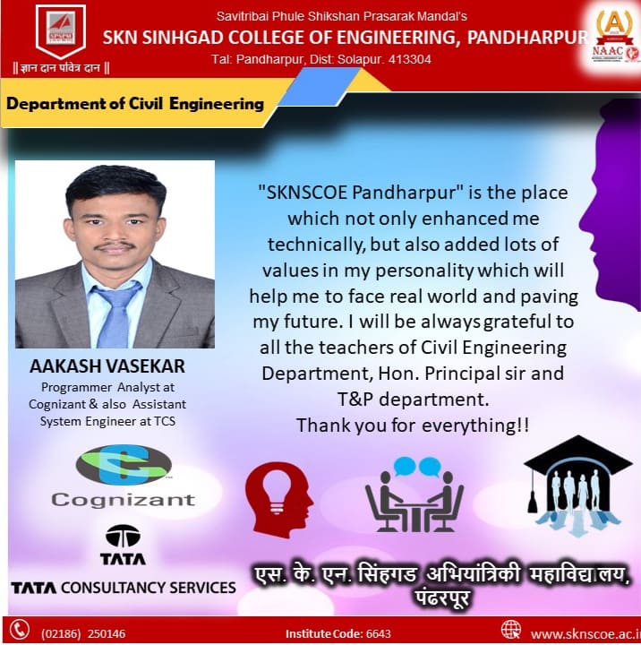 The Department of Civil Engineering, at SKN Sinhgad College of Engineering Established in the year 2010. The department offers a B. Tech degree in Civil Engineering (UG Course) with an Honors Degree in Infrastructure Engineering, M. Tech degree in Civil Structural Engineering at postgraduate (PG) level and Ph.D. degree in Civil Engineering at Post PG level. The Department is known for its state-of-the-art infrastructure, qualified and experienced faculty having expertise in diverse fields, and excellence in Industry Institute Interaction. The department has an excellent infrastructural facility which consists of about 11 Laboratories. Department have two sponsored laboratories sponsored by SIKA industries limited, and AUTODESK sponsored laboratory supported by Tech Mantra. The class rooms are equipped with ICT tools and Wi-Fi facilities are available in the department. The department has excellent computing facility with advanced software such as AutoCAD, STAAD.Pro, ETABS, REVIT. Besides high-quality teaching at both UG and PG levels, the Department is actively involved in providing high-quality technical advisory support through various sponsored projects and consultancy to various organizations