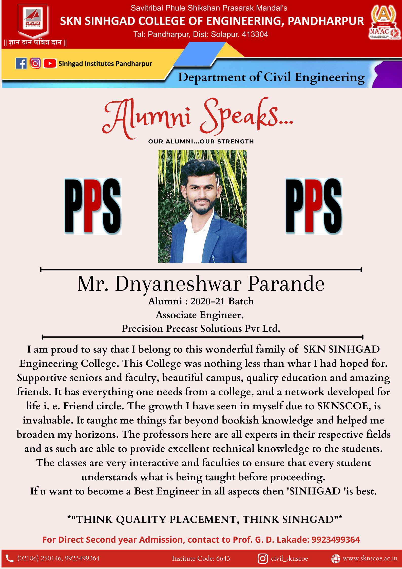 Department have strong alumni bond which helps the students to provide training, expert lecture in emerging fields which provides placement opportunities. The department has revealed a great deal of industry goodwill owing to its continuous interaction with industry for mutual sharing of the academic-industry experiences. Several of the graduates who have passed out as Civil engineer are occupying responsible positions in various Engineering Industries, Government & Semi Government Organizations and pursuing higher studies in the premier educational institutes in and outside India.
