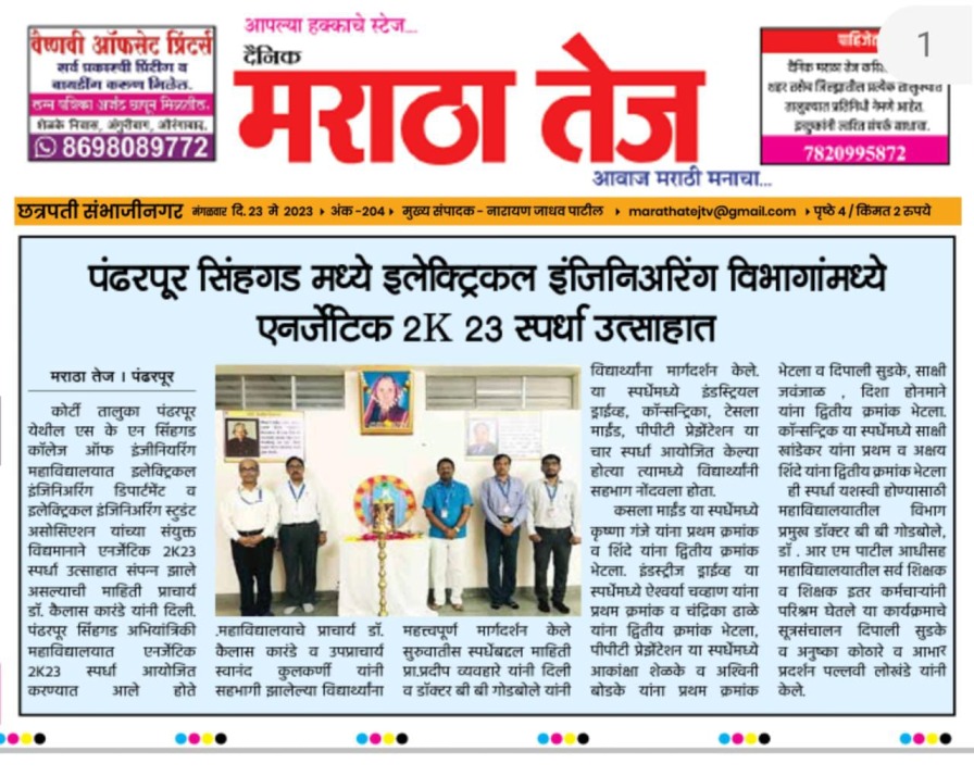 | 1 | Hunde Diksha | 2K22 Start up Idea in Electrical Engg. | Sknscoe, Pandharpur college Level | 2021-22 | Winner |