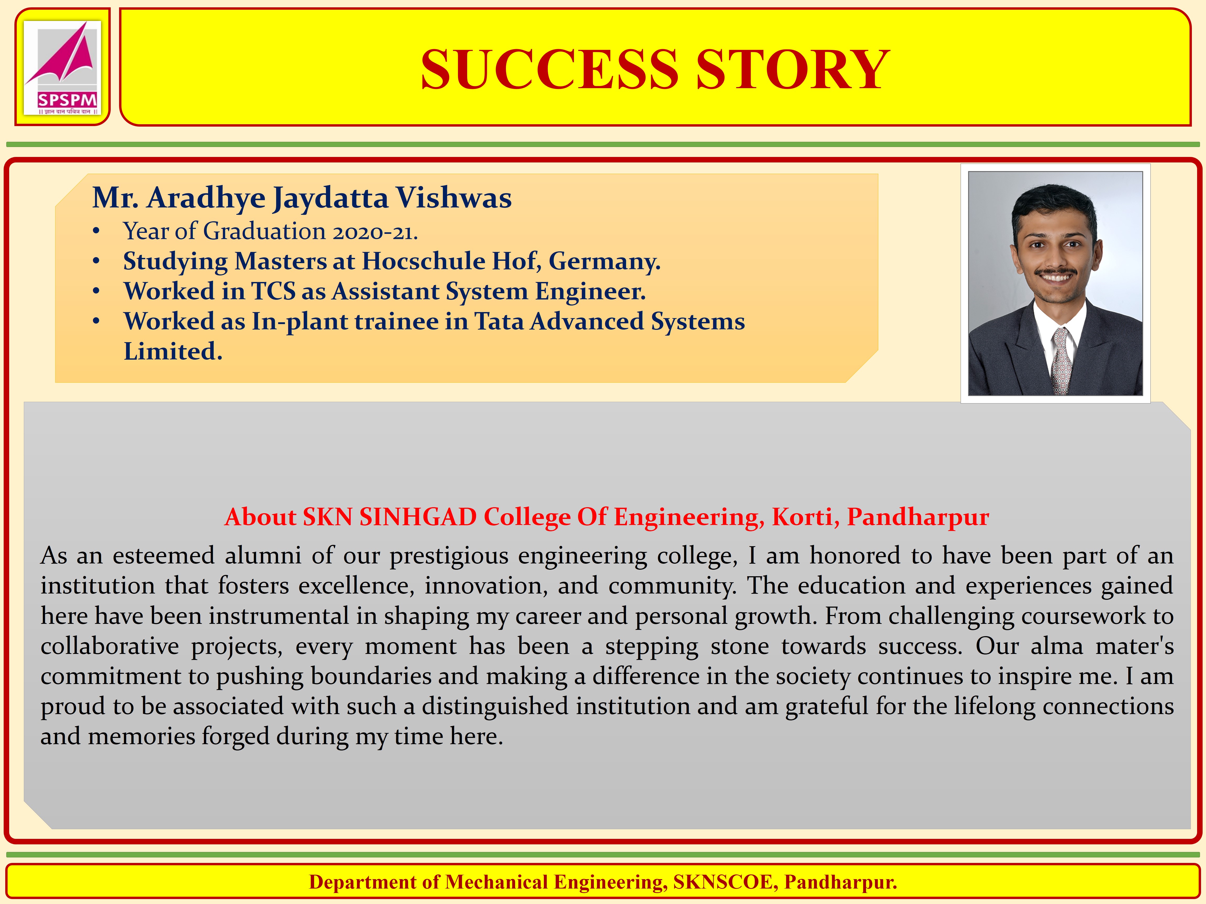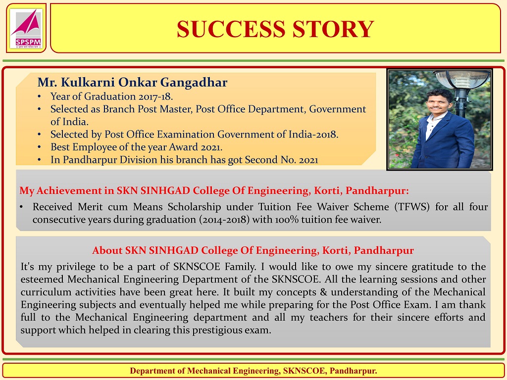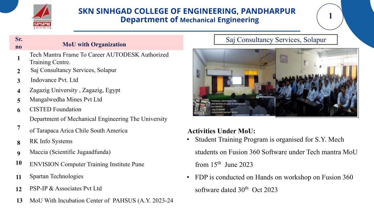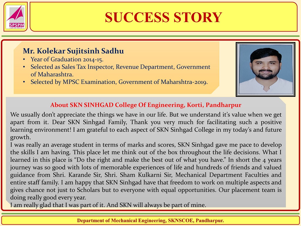 The Mechanical Engineering Department at SKN Sinhgad College of Engineering initiated its four-year Bachelor's